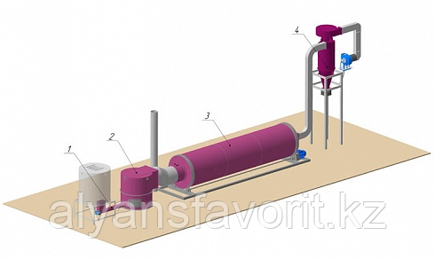 Сырье транспортером Заказчика подается в сушильный барабан, где подхватывается потоком сушильного агента. Барабан одноходовой, вращается на роликах. В барабане происходит сушка сырья. Высушенное сырье вместе с отработанным сушильным агентом, подхватывается потоком воздуха транспортируется в циклон установленный. В циклоне происходит отделение сухого сырья от сушильного агента. Сушильный агент выбрасывается за пределы помещения, а высушенное сырье через шлюзовой затвор подается на дальнейшую переработку. В составе участка сушки предусмотрены две системы управления: первая управляет теплогенератором и дымососом; вторая управляет сушильным барабаном.