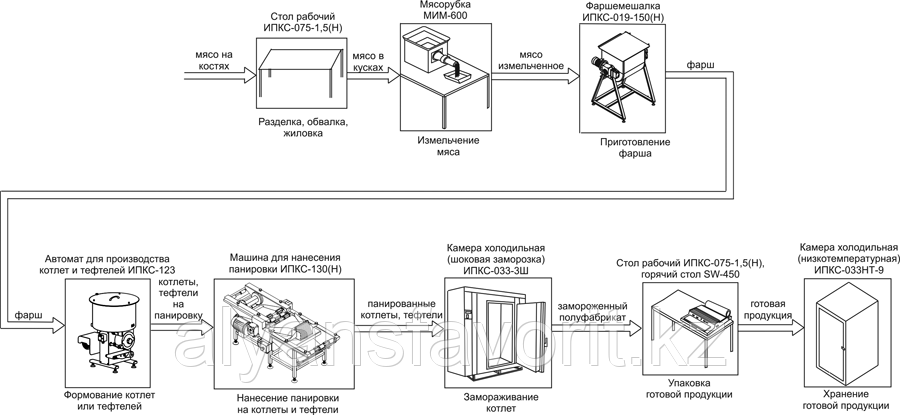 Home Промышленное производственное оборудование - производства и цеха под ключ Комплекты, производства, минизаводы и промышленное оборудование Мясная промышленность: оборудование для переработки мяса и производства мясных продуктов. Комплект оборудования для производства замороженных котлет и тефтелей ИПКС-0206, произв. 2600 кг/сутки