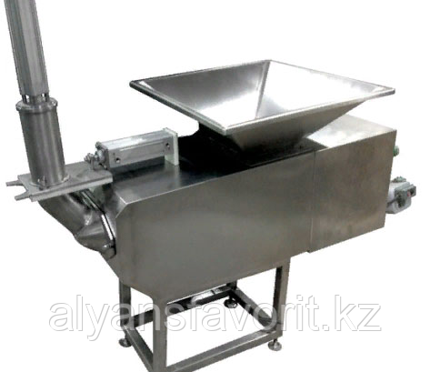 Дозатор формирования сыра «Сулугуни» присоединяется к машине двухшнековой для подачи сырной массы в дозирующее устройство с функцией доплавления и вымешивания. Сырное тесто, находящееся в двухшнековой машине, подается через переходник в цилиндр. При заполнении цилиндра шток с поршнем, расположенным в нем, поднимается до заданного уровня (уровень регулируется набором шайб). После того как цилиндр заполнится до заданного уровня, сырная масса срежется ножами, расположенными между пластинами.
