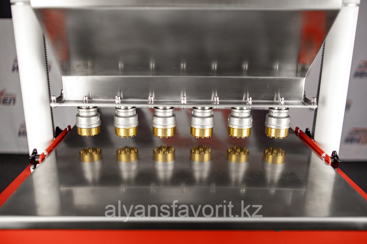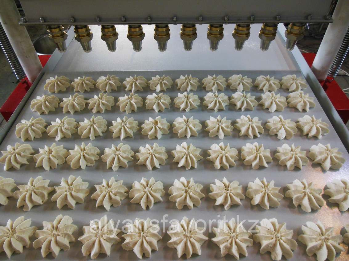 Высота и диаметр печенья регулируется с помощью регулировки нижнего стола для противней. Базовое расстояние между форсунками составляет 75мм. При желании заказчика количество форсунок и их шаг можно изменить.