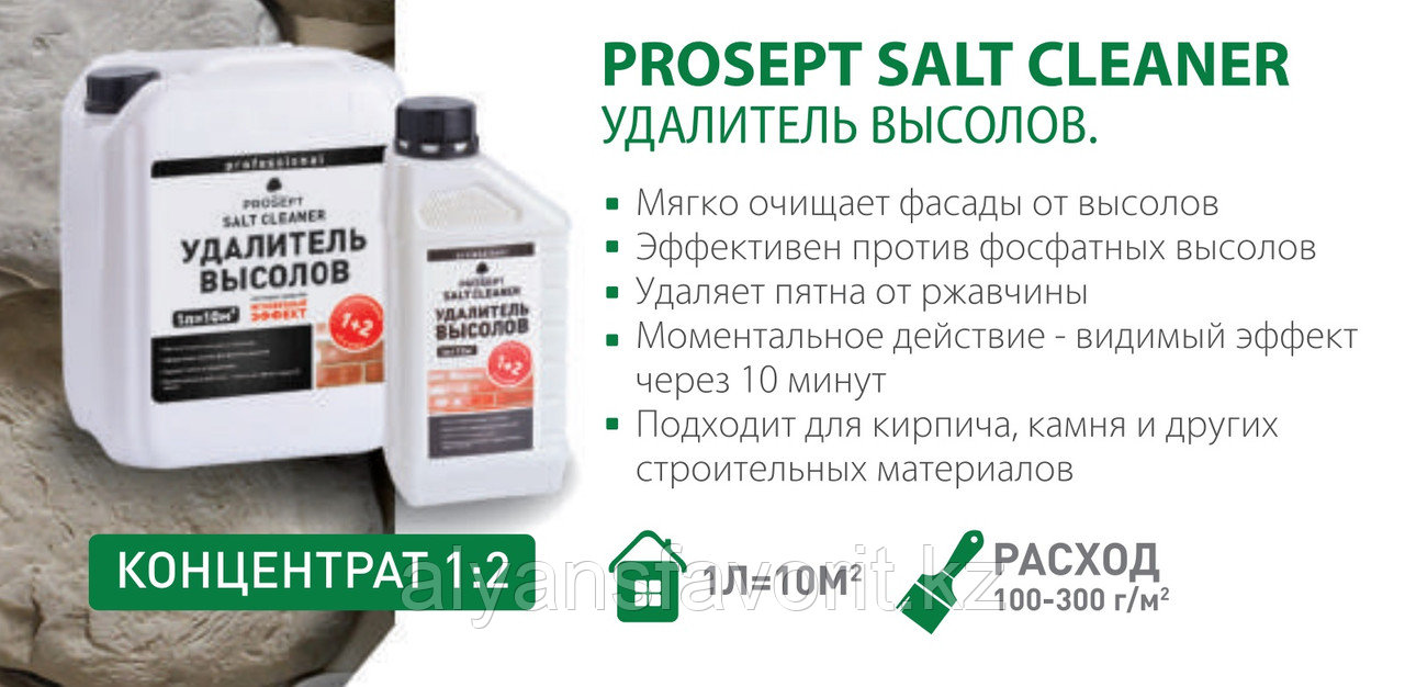 SALT CLEANER — концентрированное средство для удаления высолов и солевых отложений с кирпичной кладки, натурального и искусственного камня и других минеральных строительных материалов. Удаляет пятна от ржавчины.